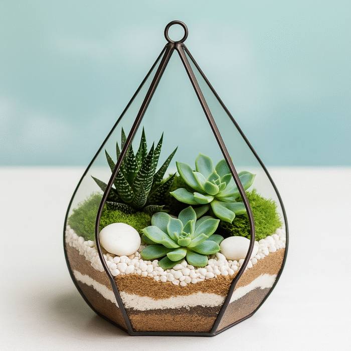 This elegant geometric terrarium features a sleek black metal frame shaped like a teardrop, with crystal-clear glass panels for full visibility of the miniature garden inside. The layered base includes fine white sand, earthy brown soil, and decorative gravel, creating a clean, structured look.