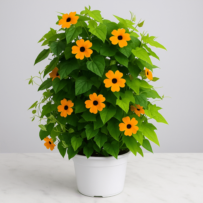 Thunbergia alata vines grown indoors may flower in the winter if they get ample sun and the temperature doesn’t fall below 60 degrees Fahrenheit.